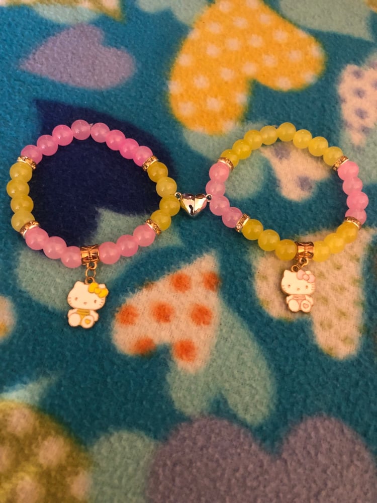 these 2 beautiful,handmade matching yellow & pink hello kitty bracelets both size 15cm (never worn)